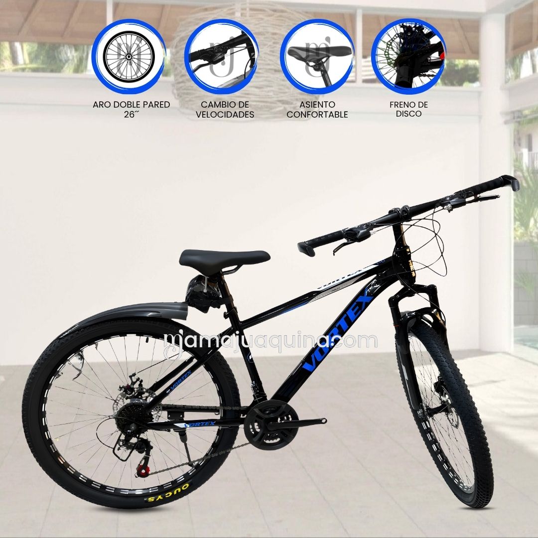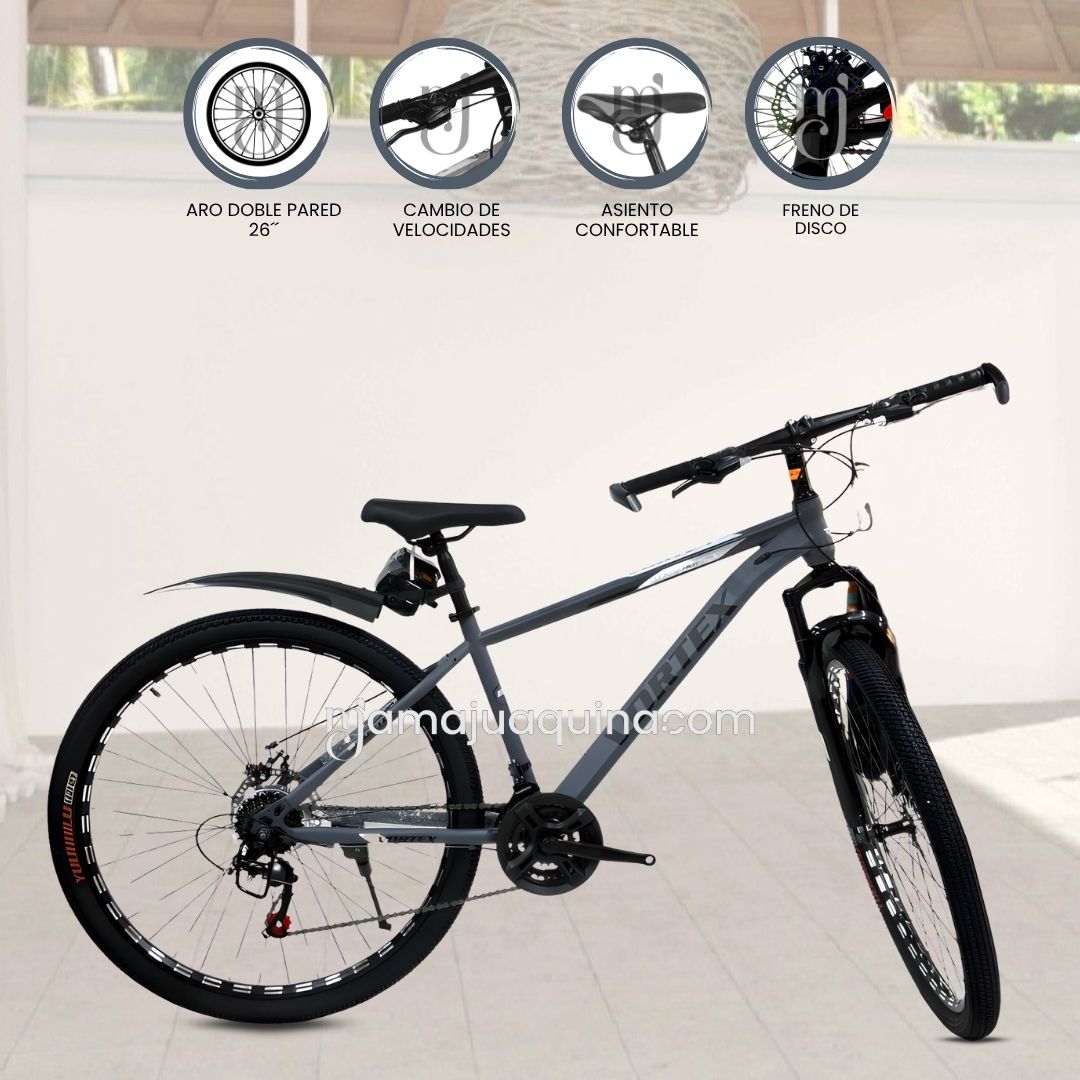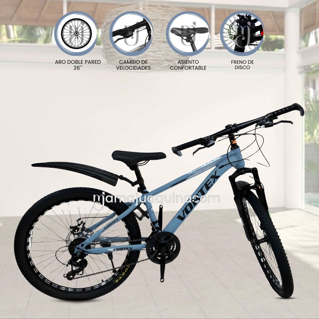 Los paseos sobre dos ruedas son parte de los mejores recuerdos de la infancia. Como mamá o papá, buscas una bicicleta que acompañe la energía y entusiasmo de tu hijo con resistencia, estabilidad y diseño moderno. La Bicicleta Deportiva Lineal Vortex Aro 26 está pensada para quienes disfrutan cada trayecto con confianza y libertad. Su estructura sólida, sistema de cambios y frenos de disco garantizan un desempeño seguro, fluido y lleno de estilo en todo momento.