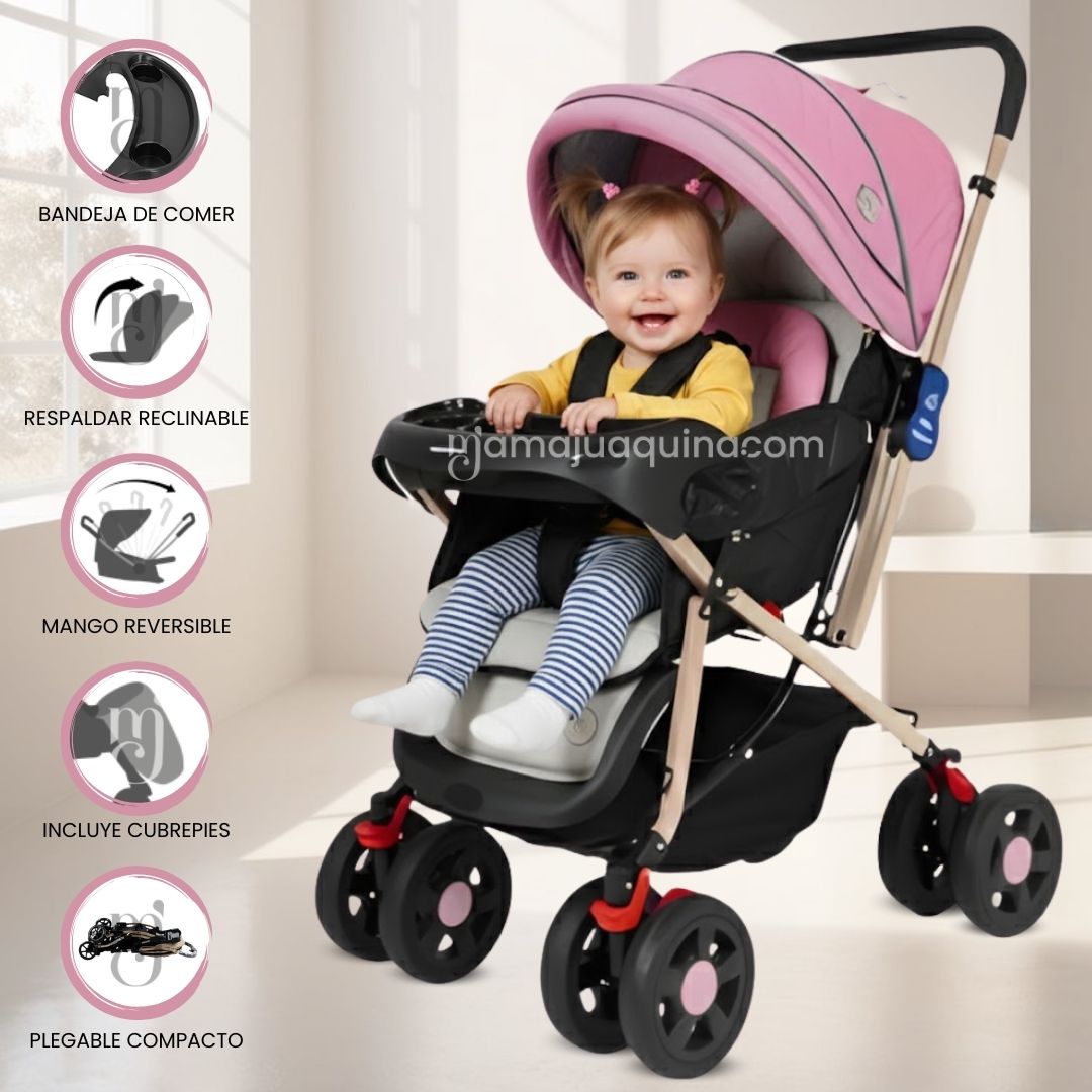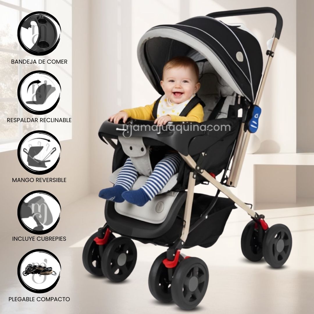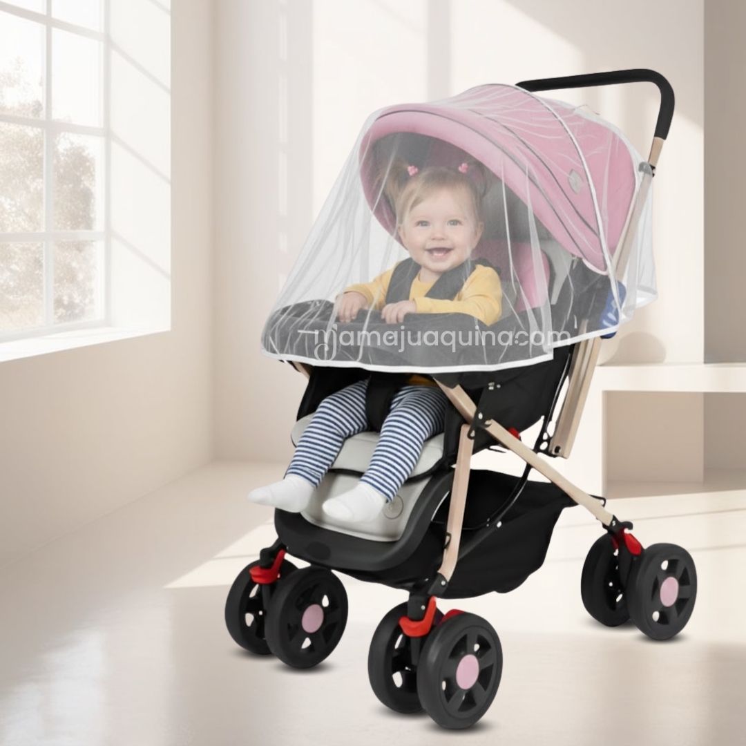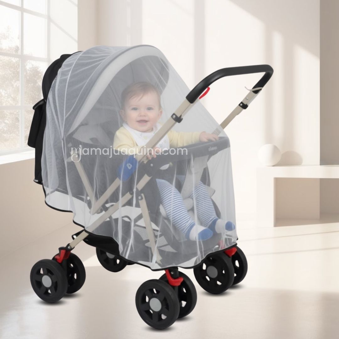 - Mesa frontal con posa vaso, canastilla amplia, bolsillo posterior y tul anti mosquitos: permite llevar todo lo necesario, mantener orden y proteger al bebé en cada salida.